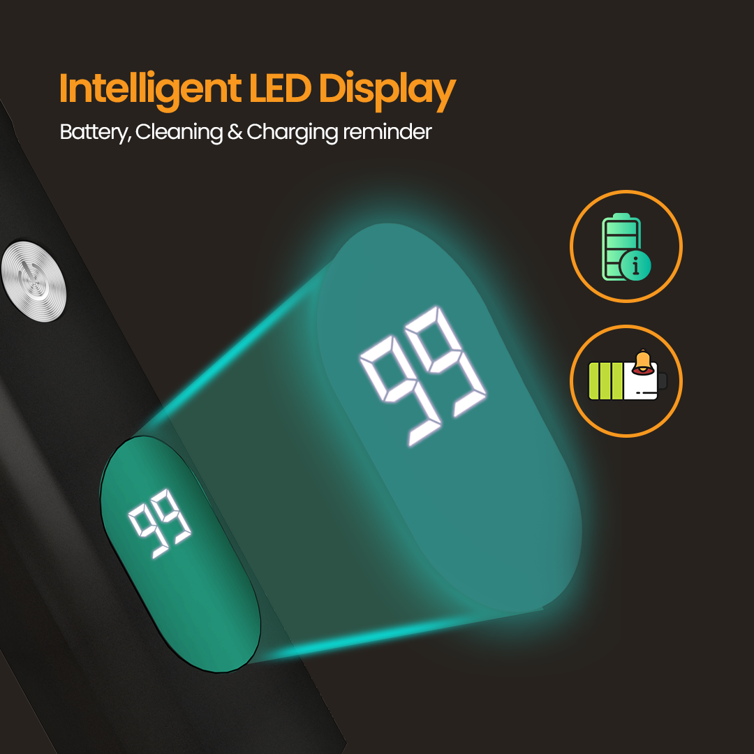 Displays battery level, charging status, and cleaning reminders for total control during grooming. -