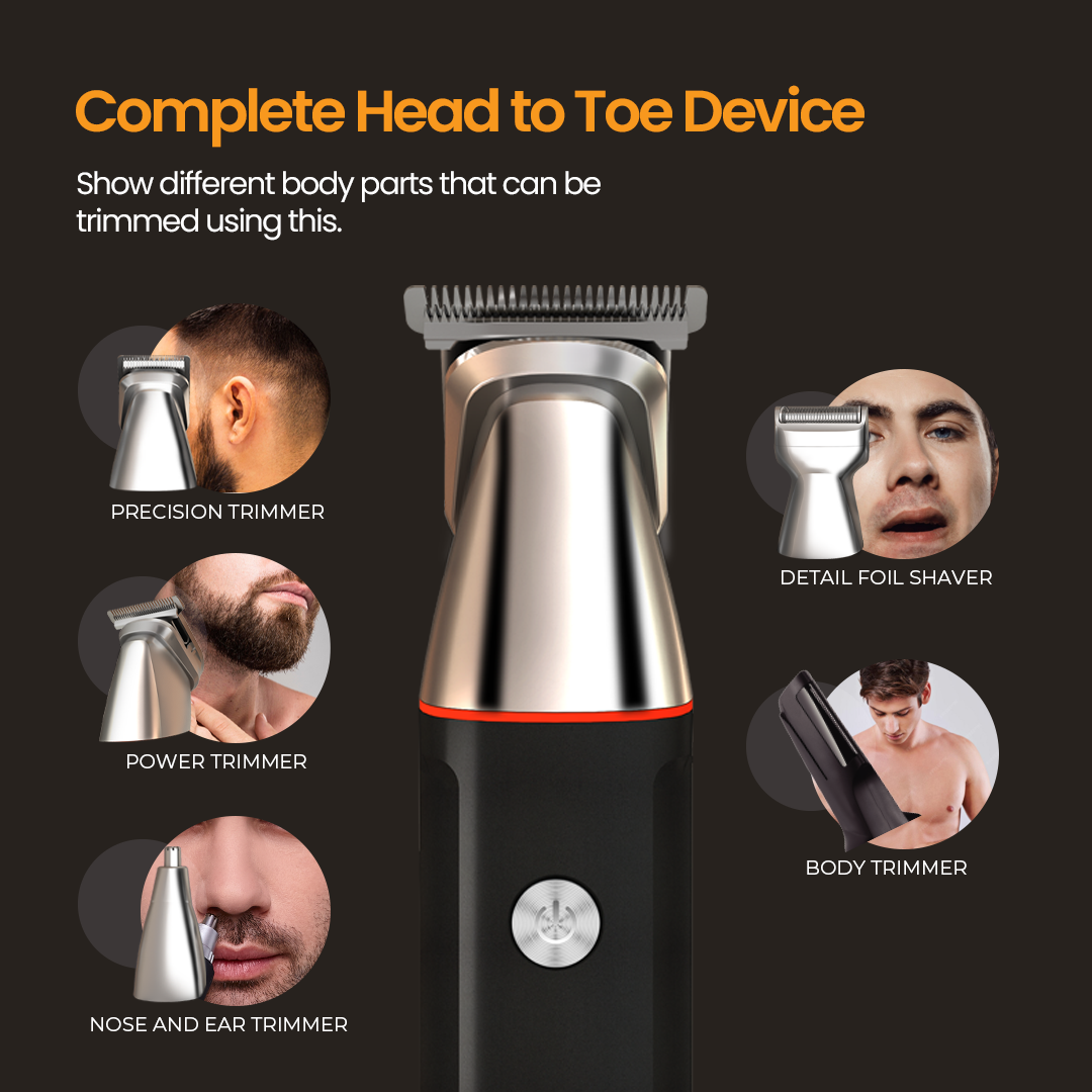 Includes attachments for beard trimming, body grooming, nose/ear hair removal, and detailed styling. -