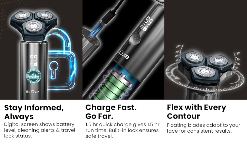 Advanced 3D flexing heads adapt to your face, jawline, and neck for a consistently close shave. The smart digital display keeps you informed with real-time battery status. Enjoy a personalized shaving experience with the 3D flexing heads that adjust to your face, jawline, and neck. Stay in control with the real-time battery status displayed on the smart digital screen.
